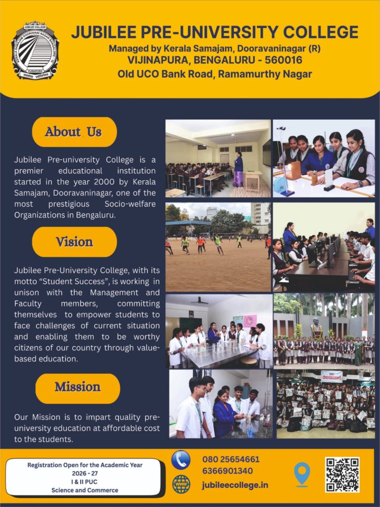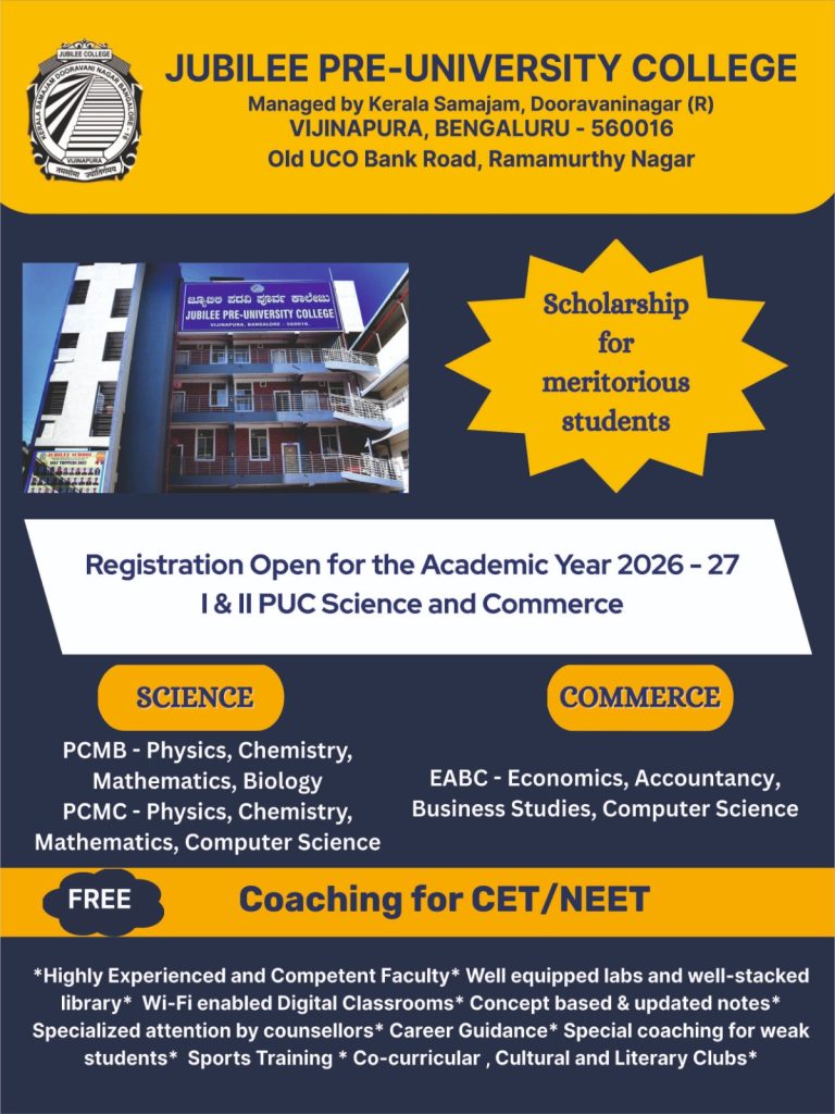 Jubilee Pre-University College is accepting applications for I PUC Science and Commerce courses for the Academic Year 2026-27. We offer quality education at an affordable fee structure, along with free CET and NEET coaching by qualified faculty.